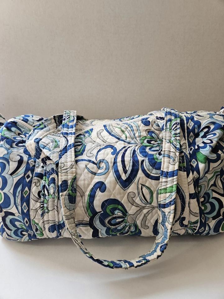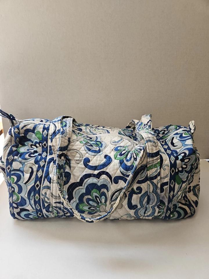 White Large Eco-Friendly Casual Weekender Luxury Duffle Bag with Blue Trim Cotton Fabric and Zipper Closure Large Capacity