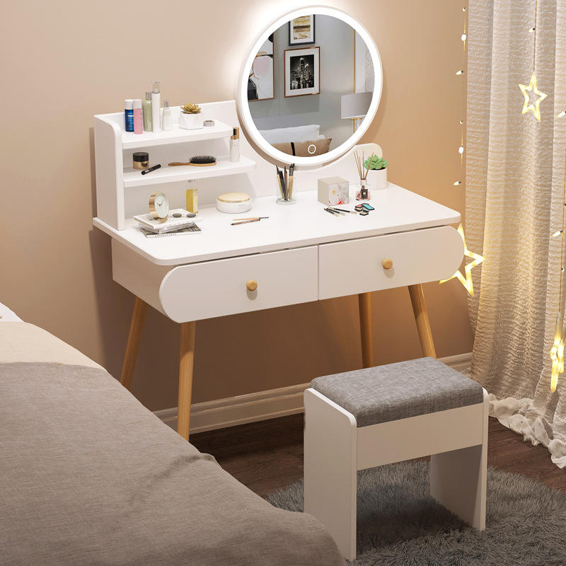 White Makeup Vanity With Lighted Mirror And Storage Drawers For Bedroom Dressing Table With Wooden Legs And Matching Stool
