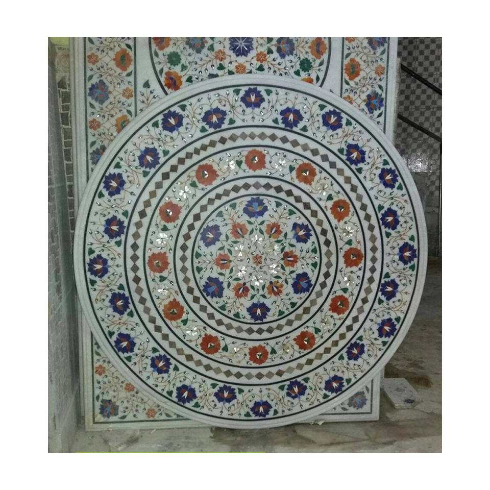 Modern White Makrana Marble Coffee Table Top Handmade with Expensive Stone Inlay Design for Hotel or Bedroom Use