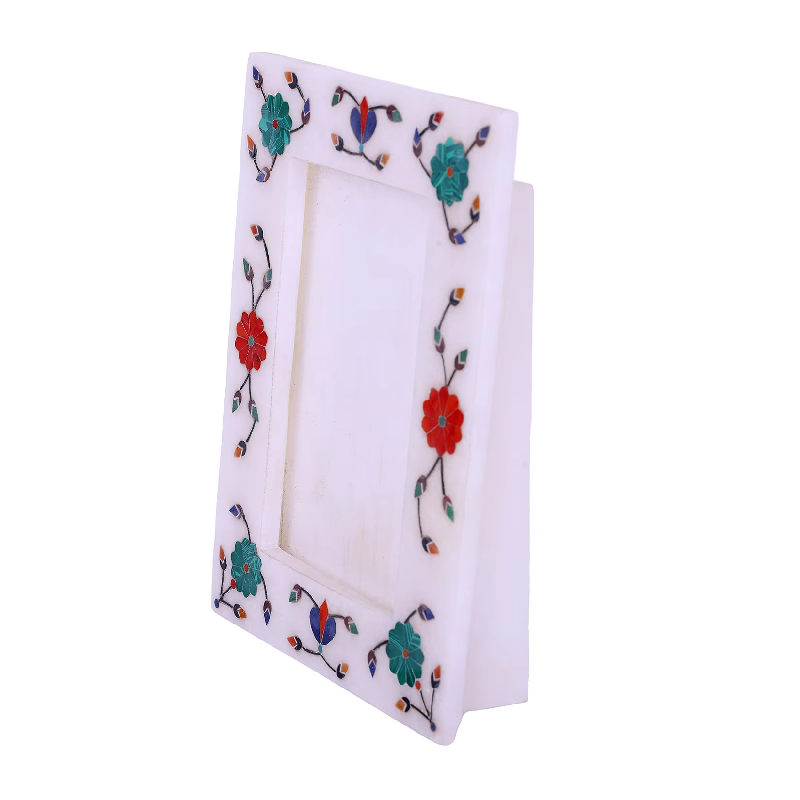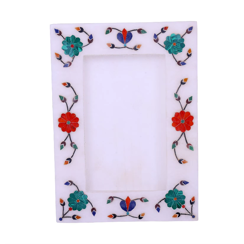 Polished White Marble 6\" Photo Frame Multi-Color Inlay Design Premium Stone Craft Material
