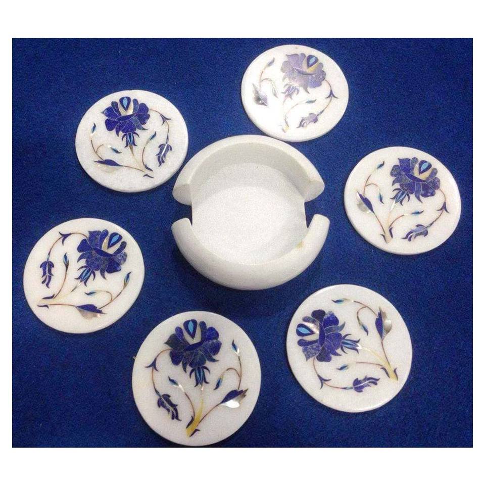 White Marble Blue Flower Inlay Round Coasters Set