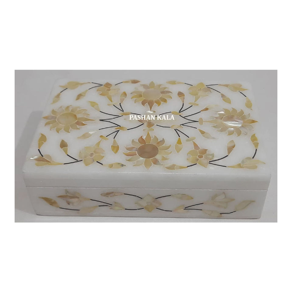 White Marble Golden Mother Of Pearl Inlay Jewelry Box Rectangle Shape Handmade Floral Design Used For Business Purpose for Gifts