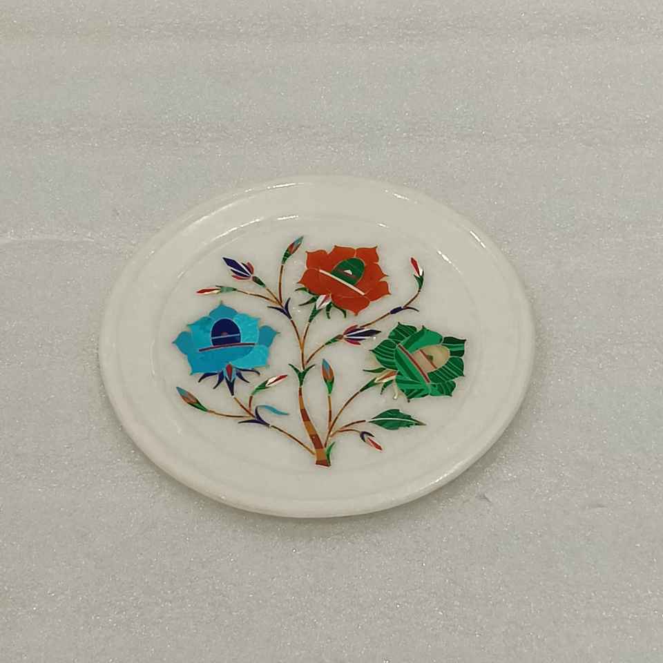 White Marble Plate with Intricate Flower-Inspired Inlay Stone Crafts