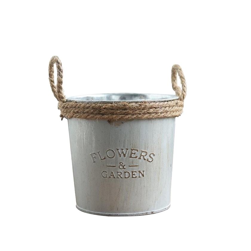White Metal Flower Pot with Embossed Flowers and Garden Text and Rope Handles Rustic Planter Indoor Decor or Gifting Set