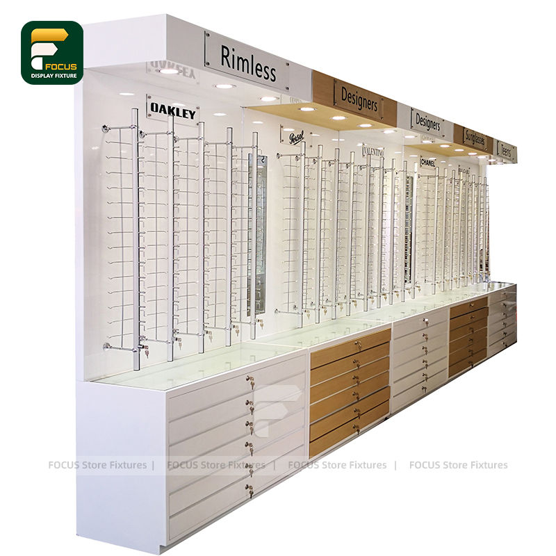 White Optical Shop Wall Display Cabinet Eyewear Showcase Stand Sunglass Rack Retail Glasses Display Storage Drawer Fixtures