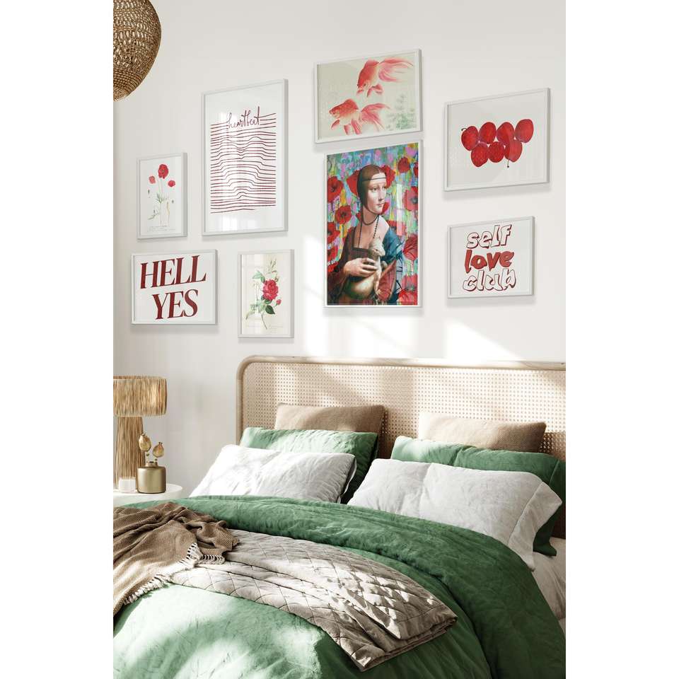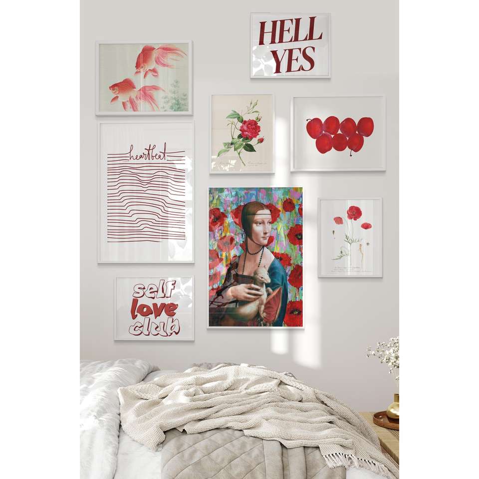 White Painting Set, 8 Piece Frame Set, Red Maximalist Vintage Themed Gallery Poster
