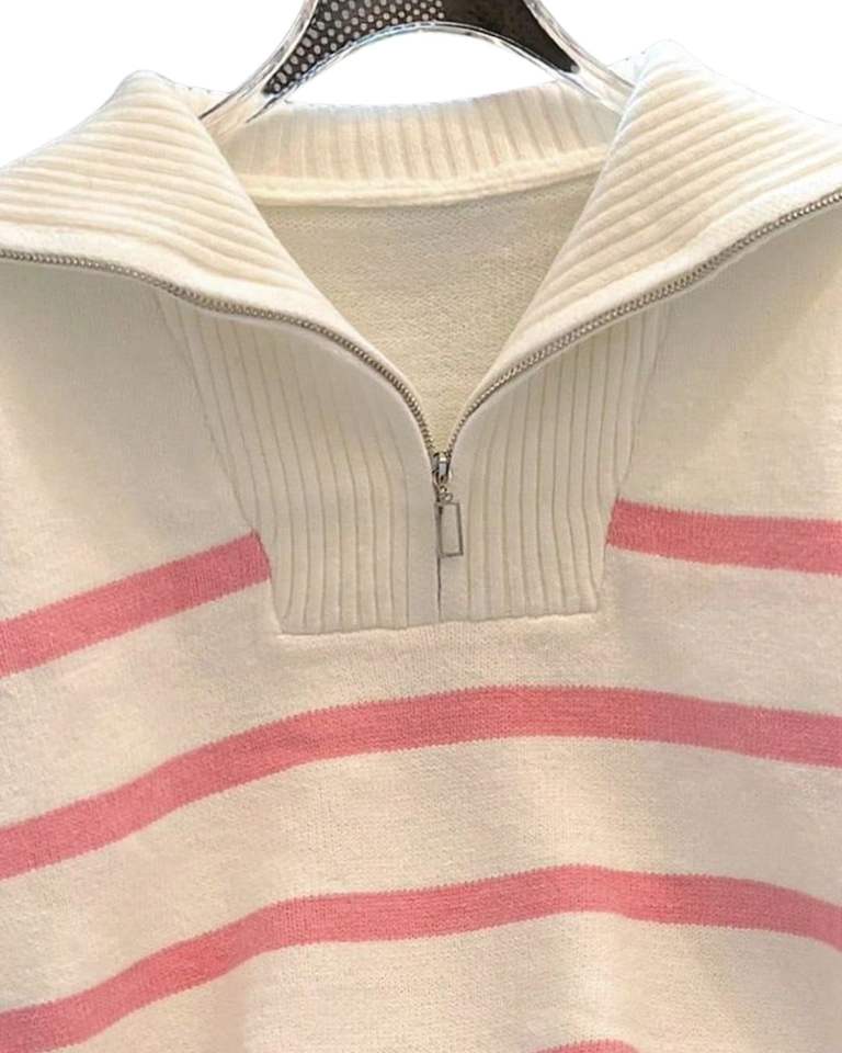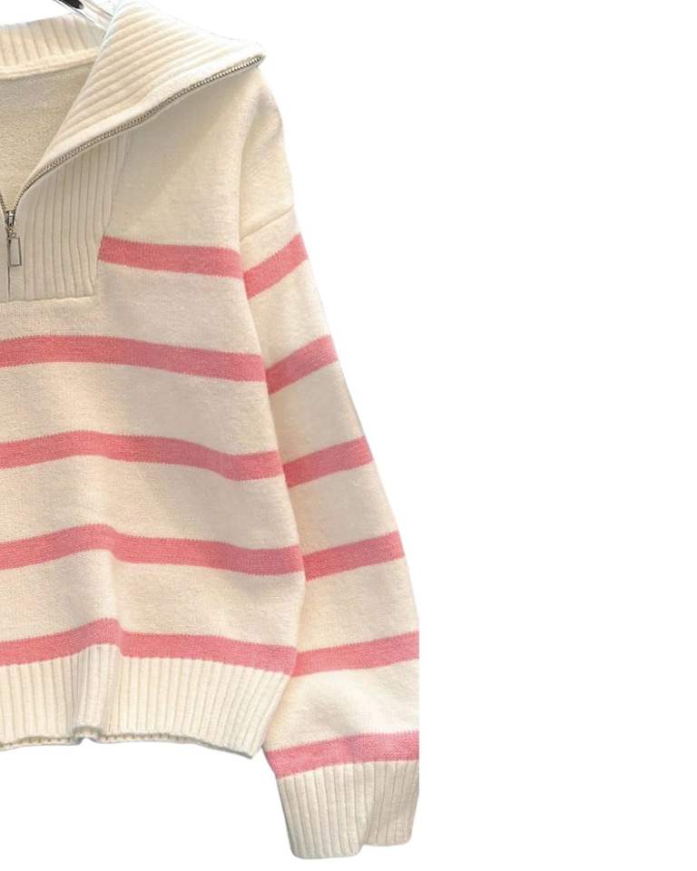 White Pink Striped Half Zip Knitted Pullover Men Winter Warm Soft Ribbed Collar Cute Casual Long Sleeve Fashion Sweater Top