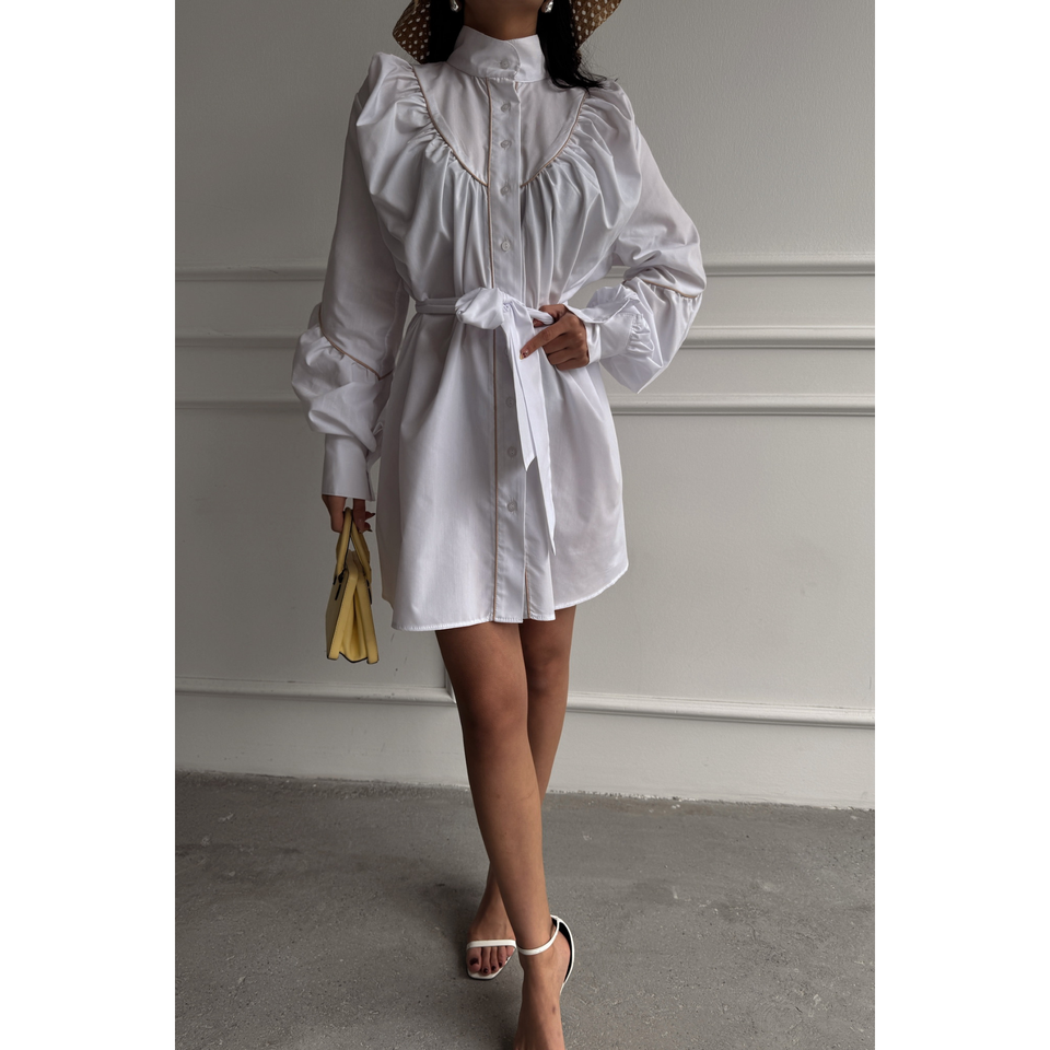 White Poplin Flared Evening Dress with Front-Button Detail and Tie-Belt