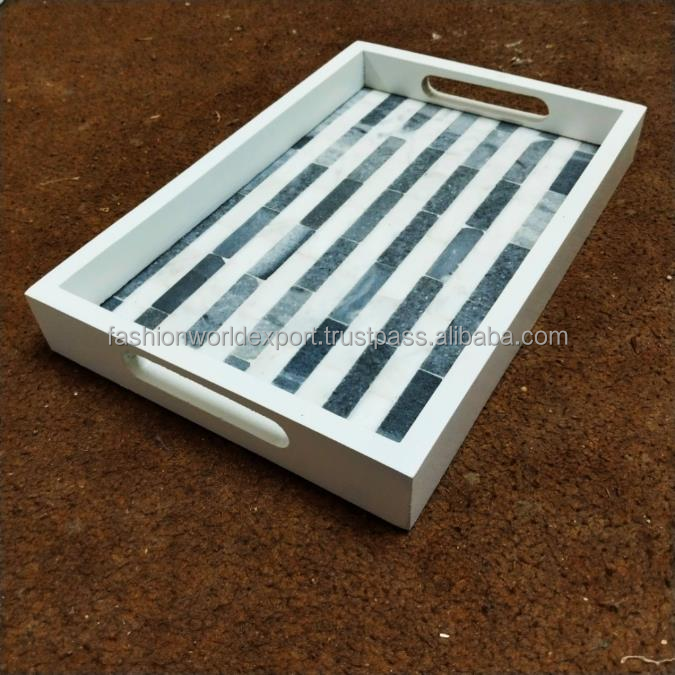 Handcrafted White Wooden Tray with Black and White Stone Resin Inlay Elegant Striped Decorative Serving Tray