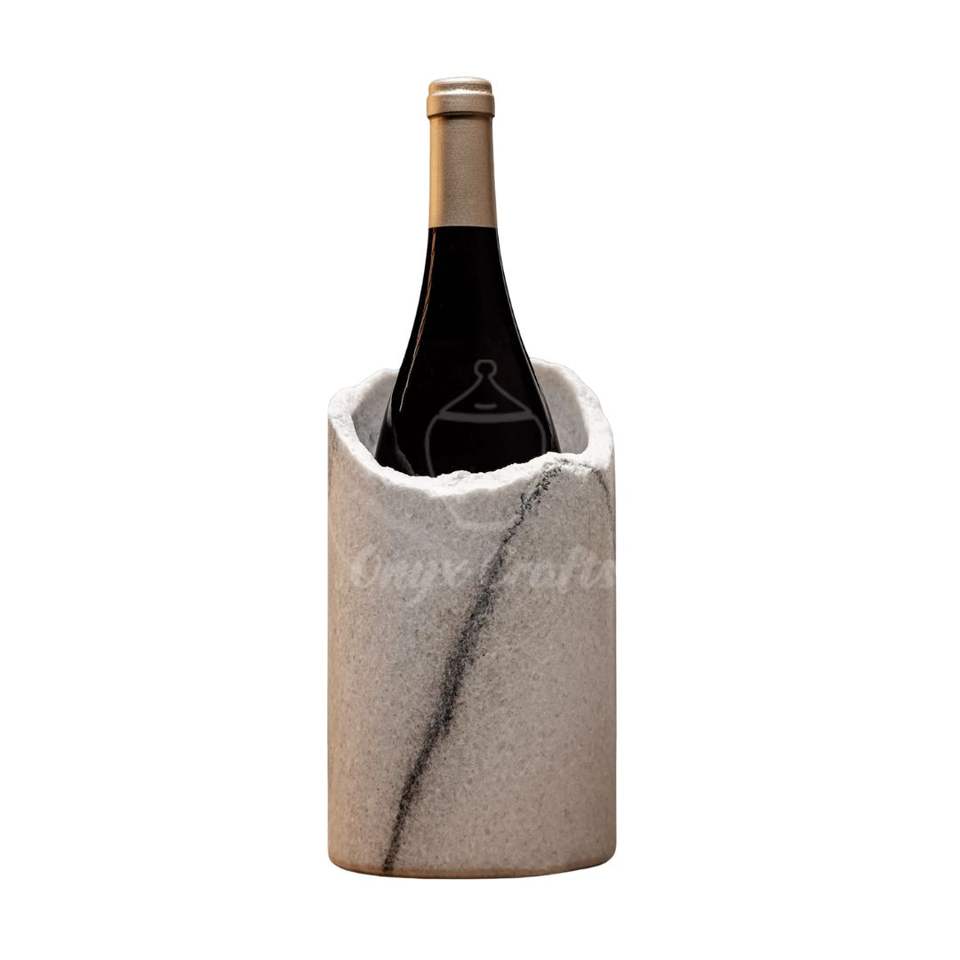 White Sculpted Marble Wine Chiller Artistic Carved Stone Bottle Cooler with Angled Top Elegant Designer Piece