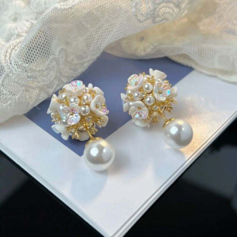 White Shell Flower Pearl Stud Earrings for Women Ball Double Side Elegant Vintage Fashion Jewelry Gold Earrings