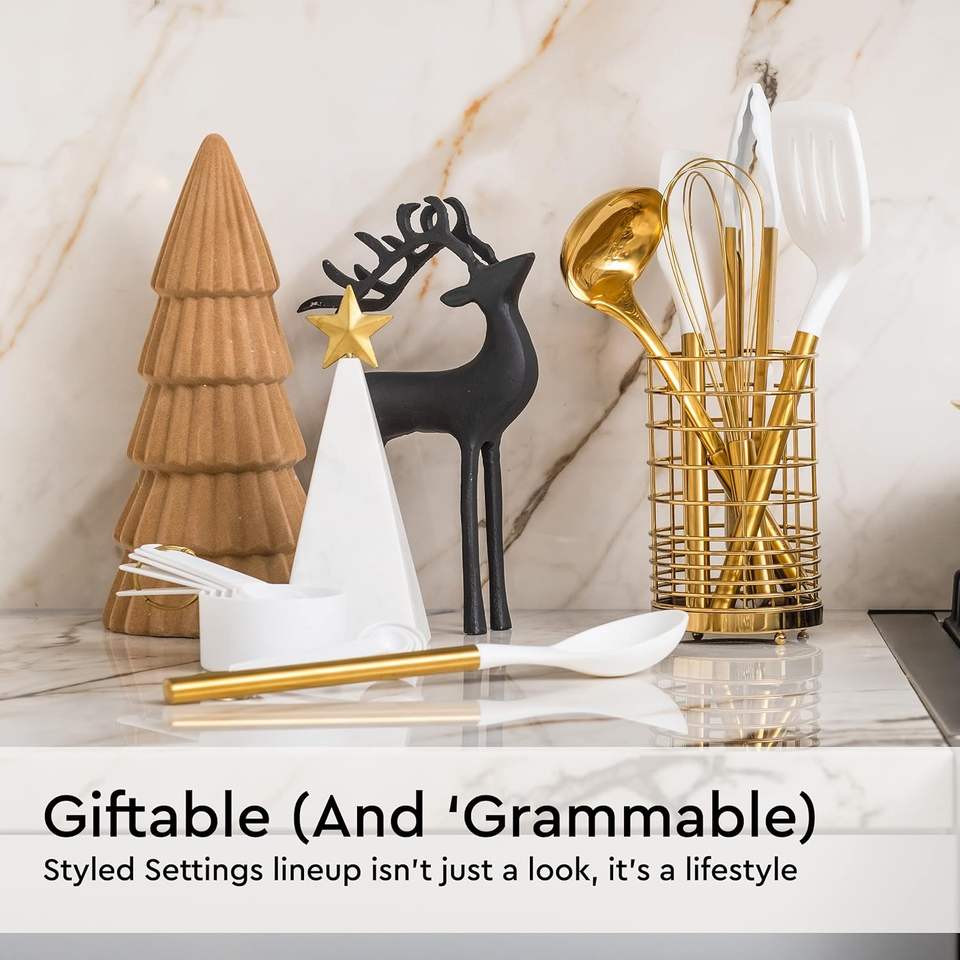 White Silicone and Gold Cooking Utensils Set with Gold Utensil Holder: 7PC Set Includes White Utensils Set,Gold Spatula,Gold Whi