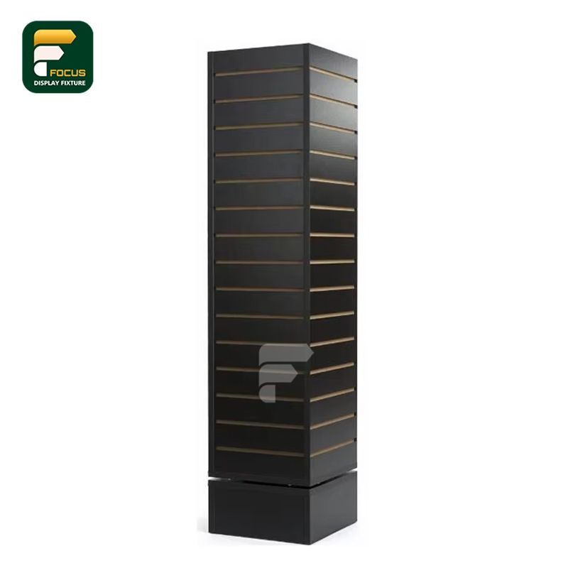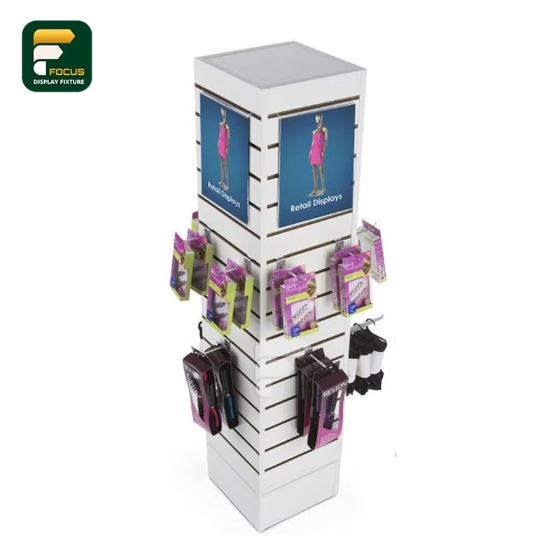 White Slatwall Display Tower Mobile Design Adjustable Shelves Product Display Unit for Retail Spaces