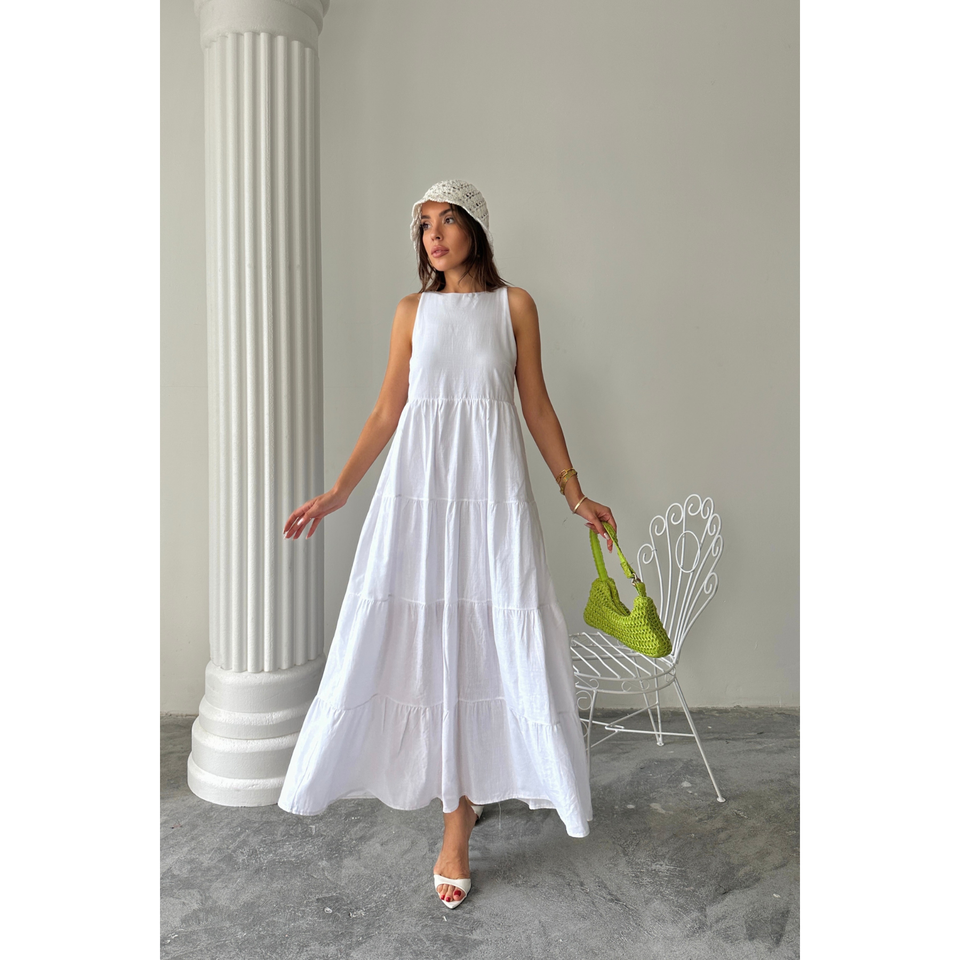 White Sleeveless Long Linen Dress With Side Slit For Women Casual Maxi Style S Size