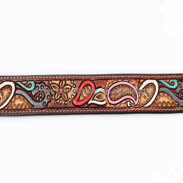 White Stitching and Colorful Hand Carving Design Brown Western Leather Tooling Belt for Men With Designer Antique Brass Buckle