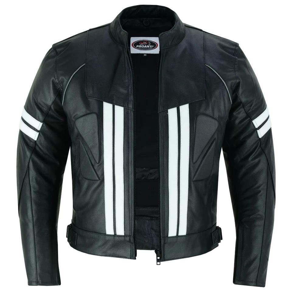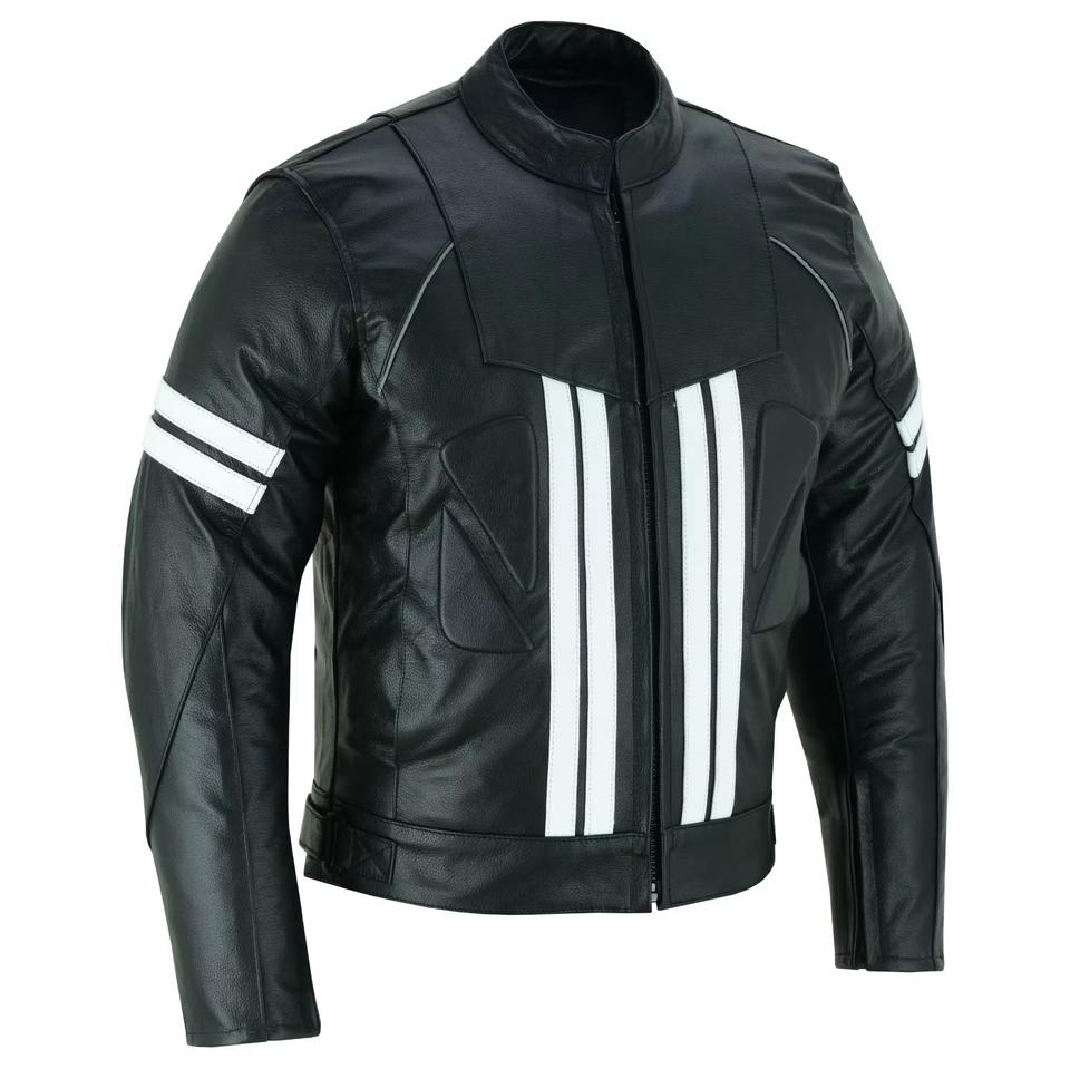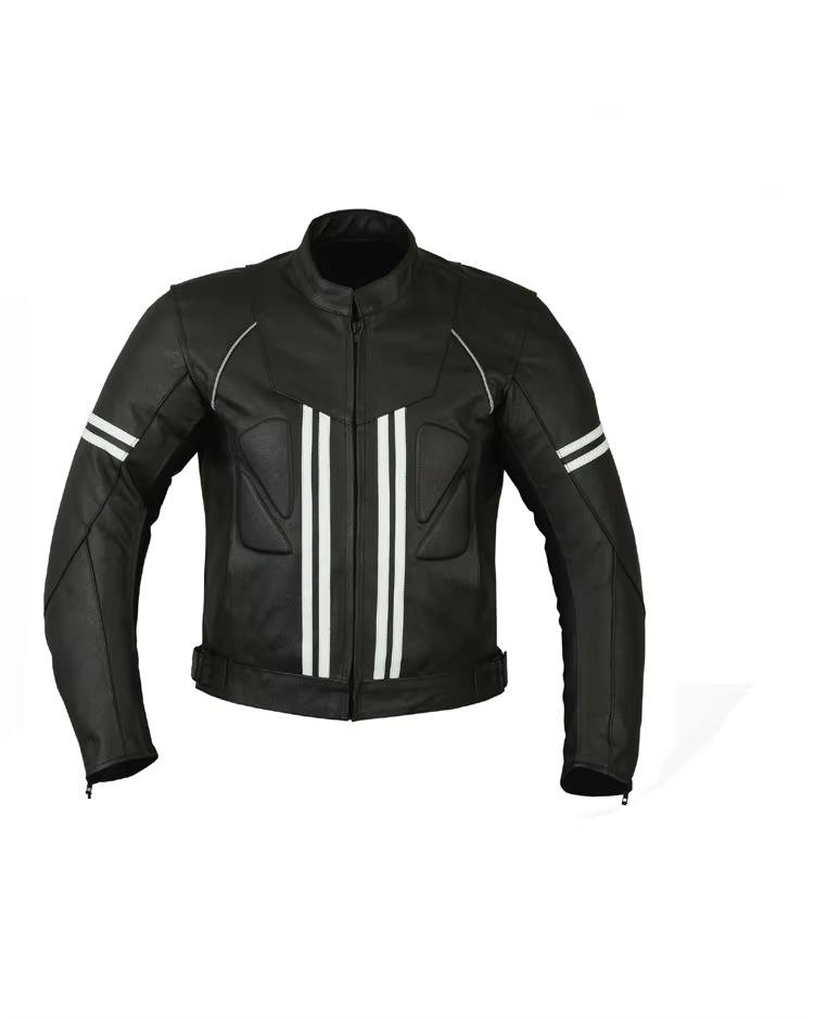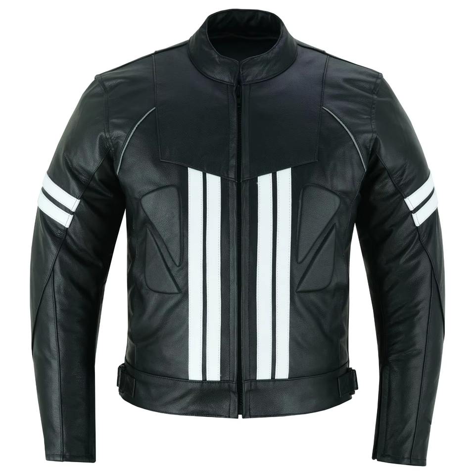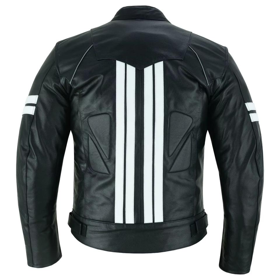 White Strips Printed Leather Racing Jacket Biker Style Winter Waterproof Windproof Breathable Motorbike Jacket