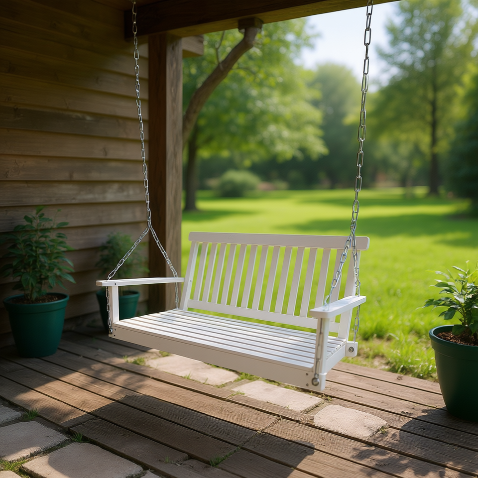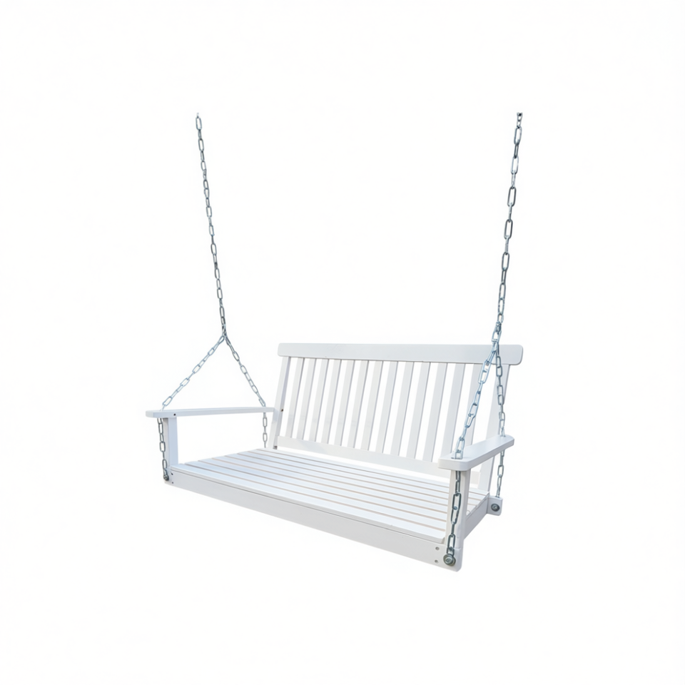 White Teak Wood Bench Swing With Chains For Front Porch Outdoor Patio Garden Yard Backyard Sunroom