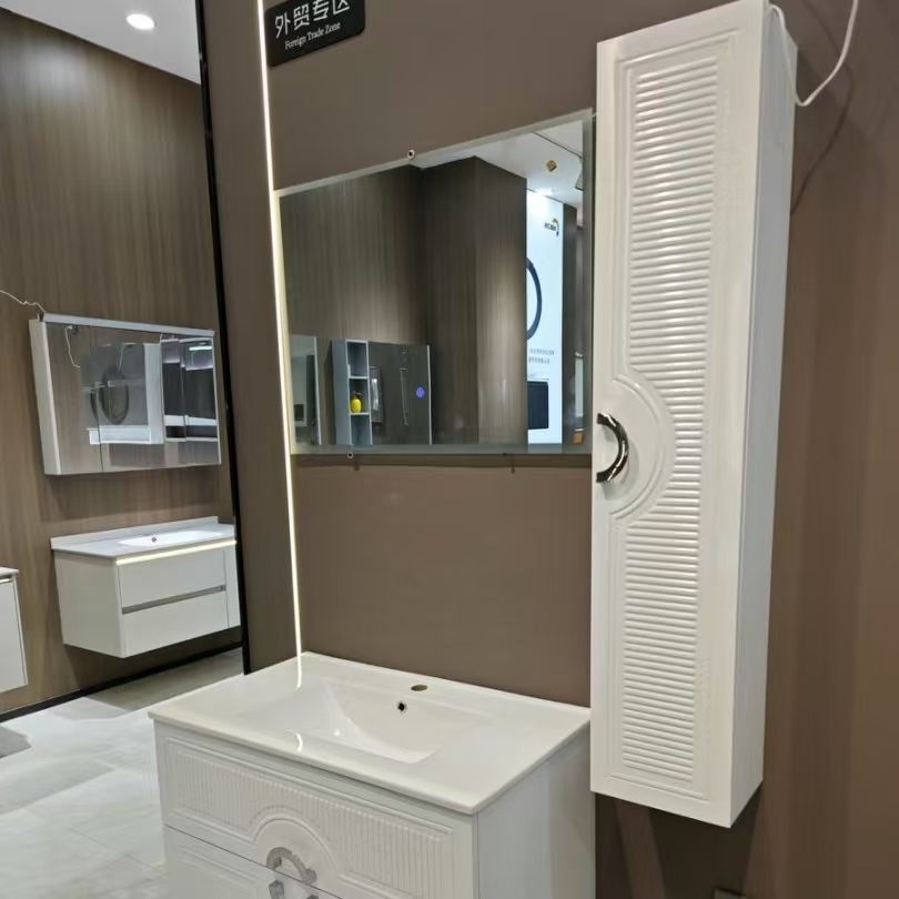 White Vanity Unit with Tall Louvered Cabinet: Stylish & Functional for Bathroom Bathroom Vanity Set: White Sink,Bathroom Cabinet