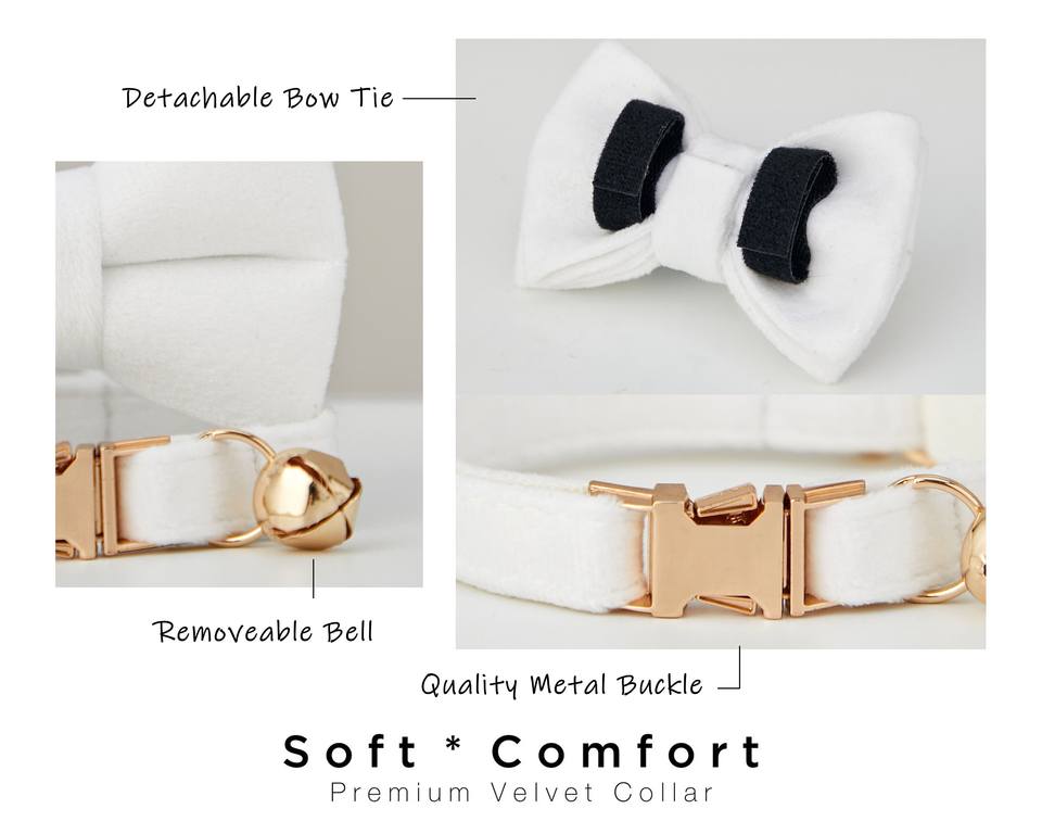 White Veet Personalized Cat & Small Dog Collar Bow Tie Leash Set,Custom Engraved Kitten Puppy Name Tag,Free Gold Bell,Male