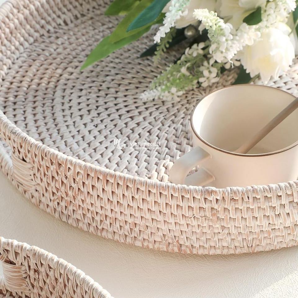 White Wash Rattan Round Serving Tray With Handles, Premium Export Quality OEM and ODM Available Viettimecraft