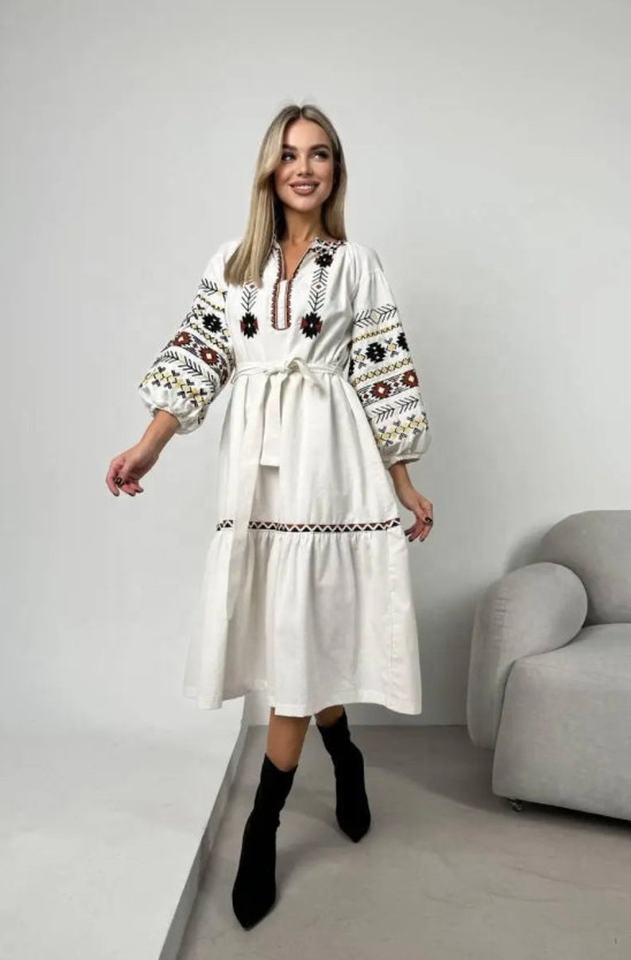 White and Black Color Ukrainian Traditional Dress Stunning Beautiful Style Long Sleeve Dress Luxury High Quality Linen