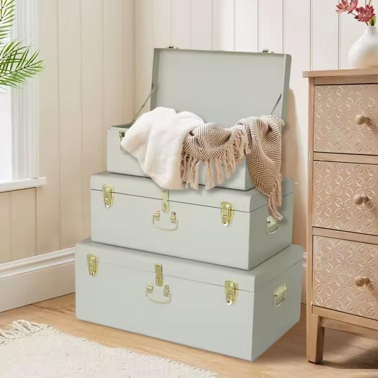 White and Gold Handmade Metal Material Iron Storage Trunk Set of 3 Pcs Nested Tin Black Trunk Storage Box