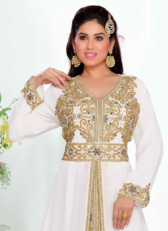 White embroidered georgette islamic kaftans With Sun-proof hijab.