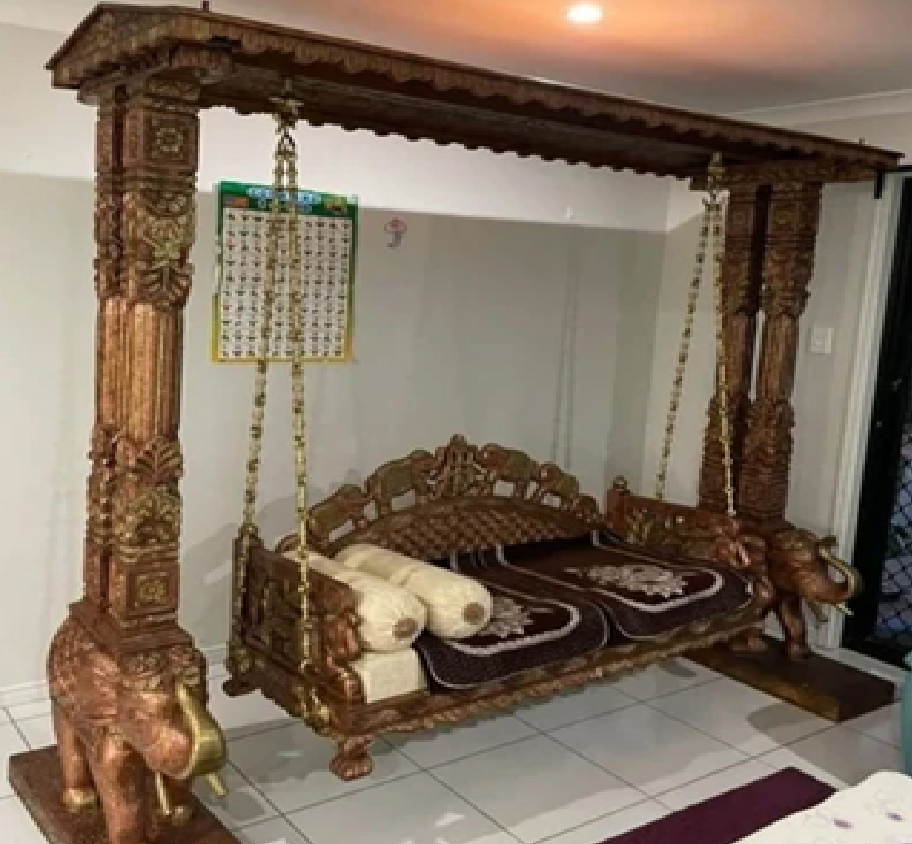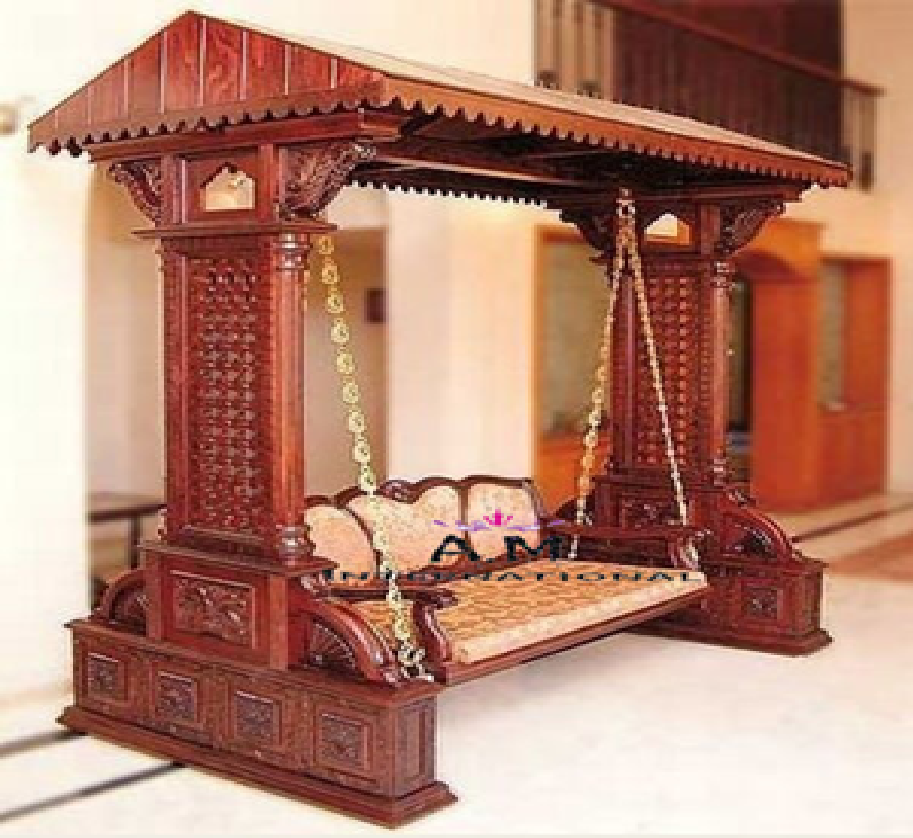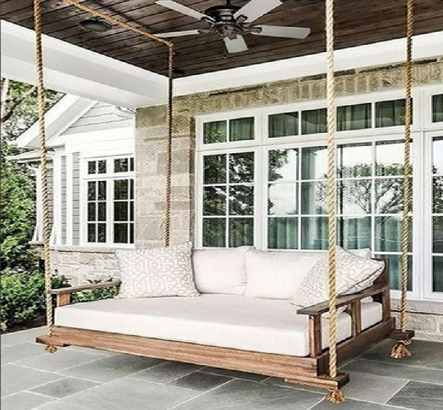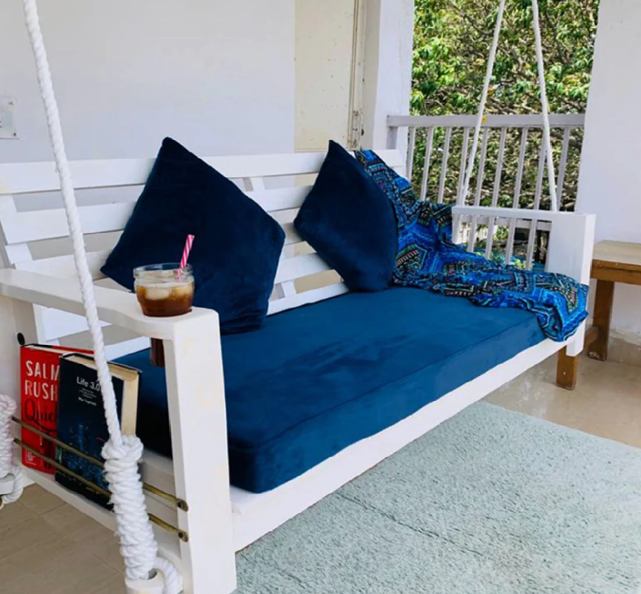 White outdoor swing with blue cushions and armrest storage. Stylish balcony seating. Available at wholesale prices