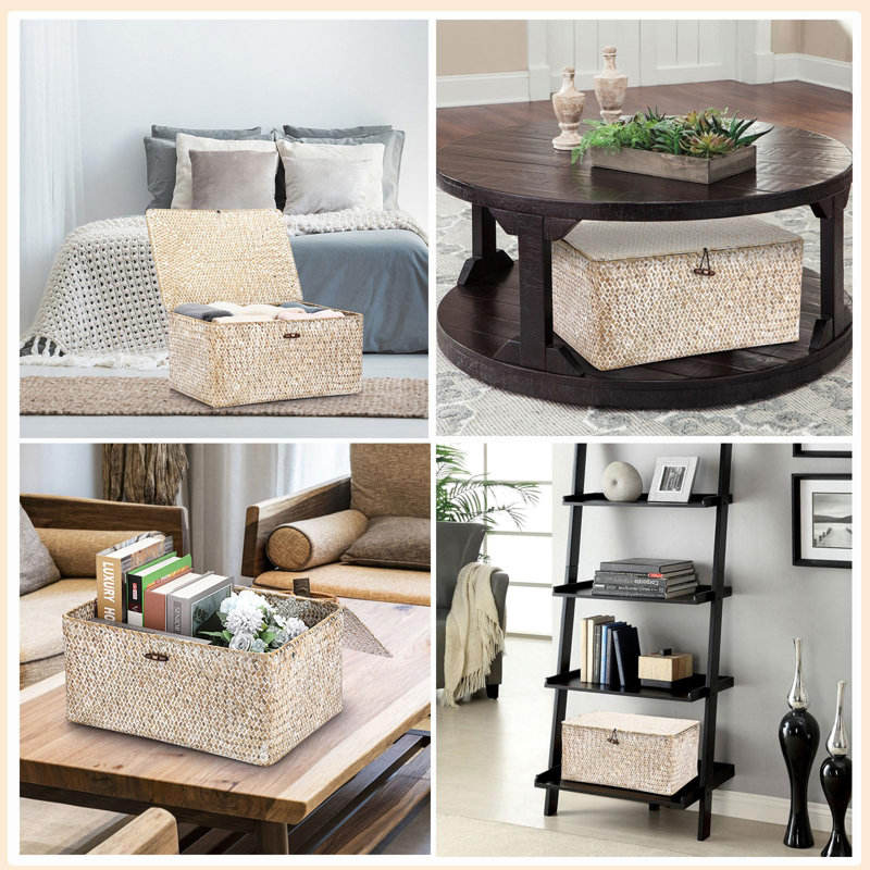Whitewash Seagrass Storage Bin Handwoven Rectangular Wicker Shelf Basket with Lid Home & Wardrobe Organizer