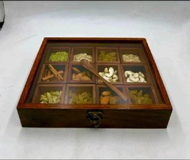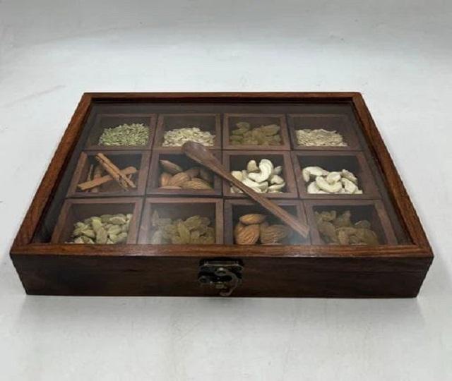 Whole Spices Filled in a Sheesham Wood Spice Box With Spoon|Indian Masala With Wooden Box from f s international