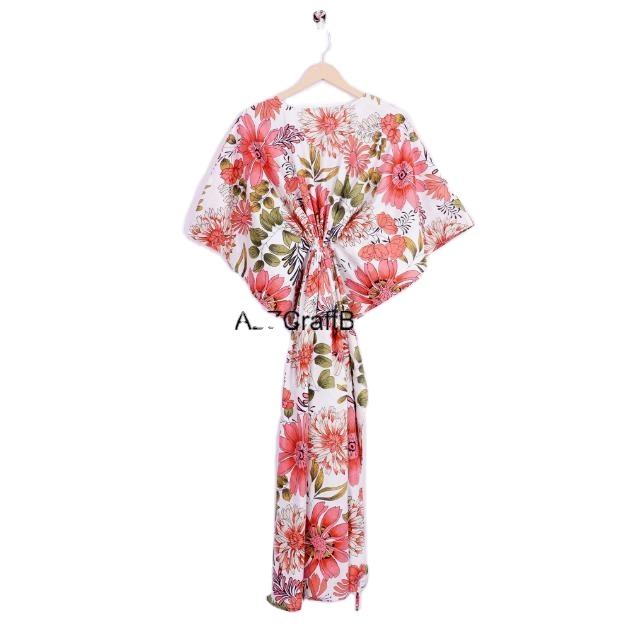 Wholesale 100% Cotton Eco-Friendly V-neck Ruffles Kaftan Tunic Dress Midi Casual Daily Discharge Printed Breathable Washable