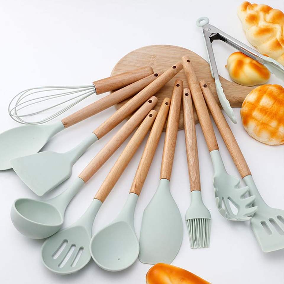 Wholesale 12 PCS Kitchen Cooking Set Holder Baking Gadget Nonstick Eco-Friendly Dishwasher Safe Silicone Spoons Wood Handle
