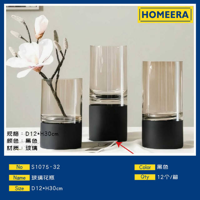 Wholesale 12-Piece Set of Black Glass Borosilicate Vase D12xH30cm Minimalist Design Style Tall Flower Vases for Home Decor