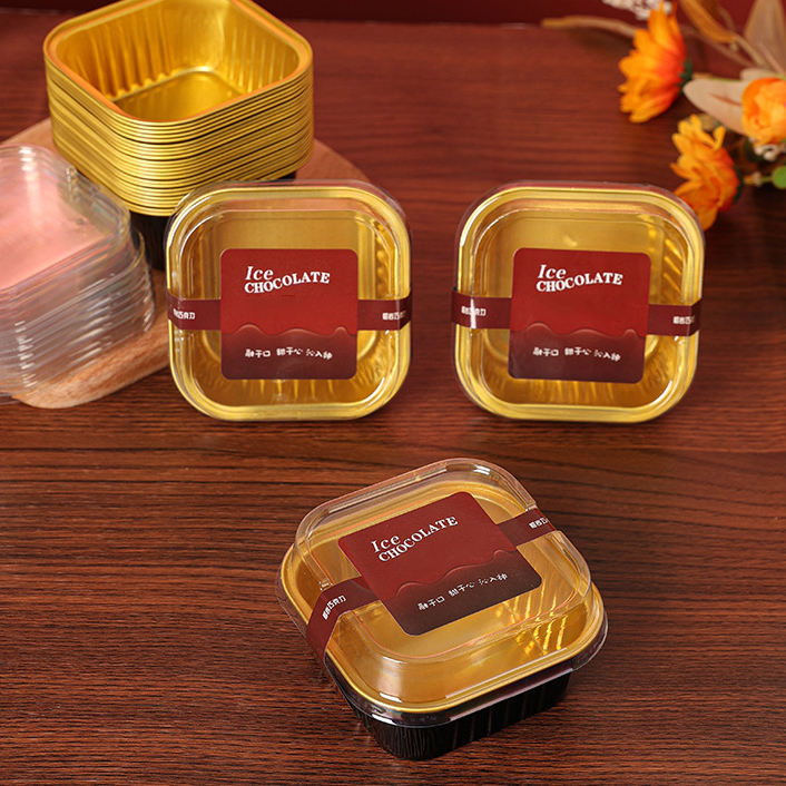 Wholesale 150ML/5oz Square Aluminium Foil Dessert Cups Baking Tray Dessert Boxes Cheese Cake Cups With Plastic Lids