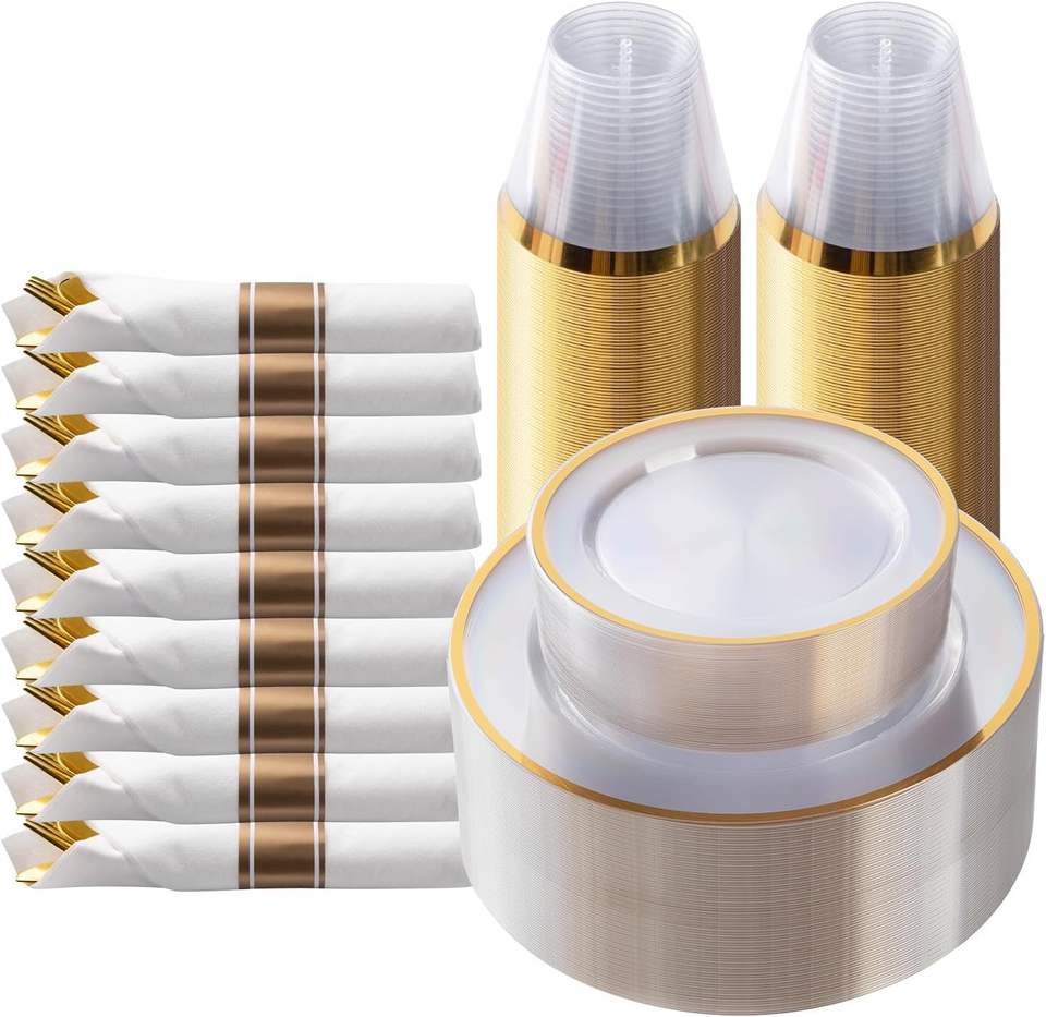 Wholesale 175pcs Elegant Gold Disposable Plastic Dinnerware Set Elegant Gold Wedding Cup Plates Dinner Plates for Parties Free