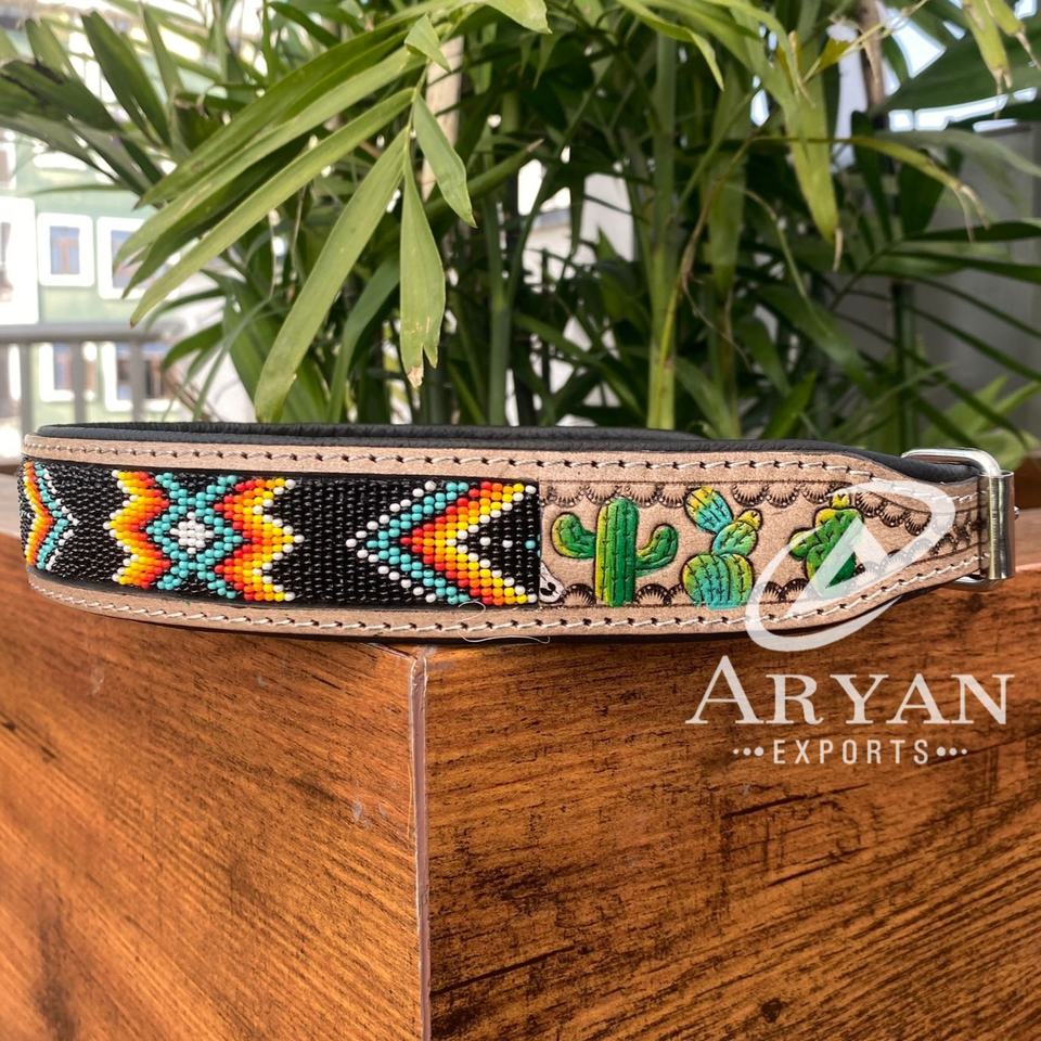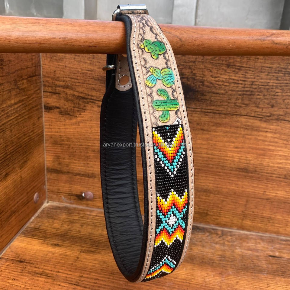 Wholesale 2024 Heavy Duty Hand Tooled Leather Beaded Dog Collar Adjustable Training Genuine Leather High Quality Pet Dog Collars