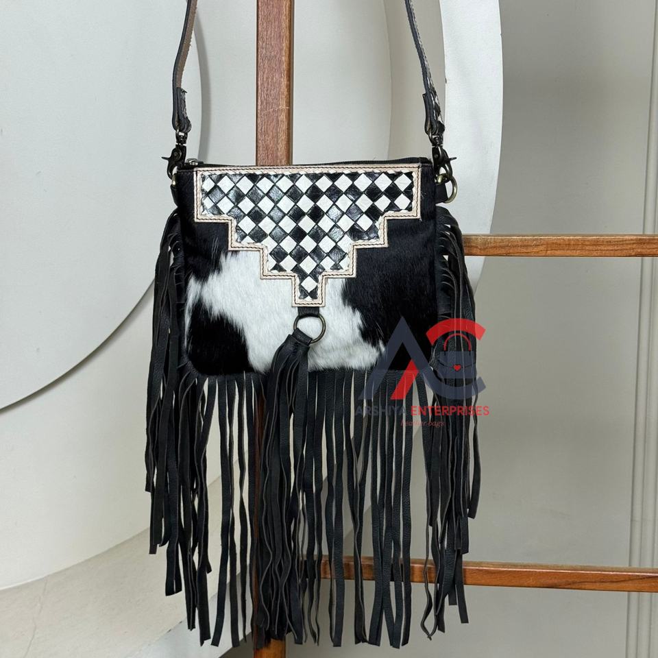 Hand Tooled Cowhide Leather Checkered Design Fringe Handbag