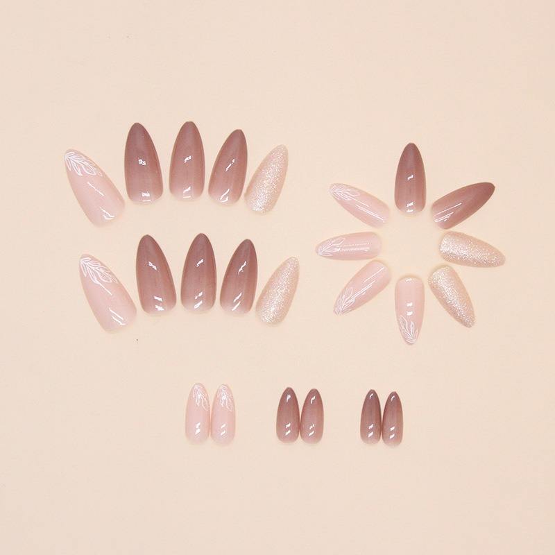 Wholesale 24pcs Elegant Fall Leaf Glitter Nude Light Coffee Almond Press-On French Fake Nails Artificial Coffin Manicure