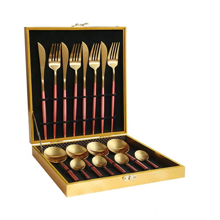 Wholesale 24pcs Stainless Steel Cutlery Set Luxury Vintage Household Flatware Set Wooden Box Package Matte Brushed Gold Cutlery