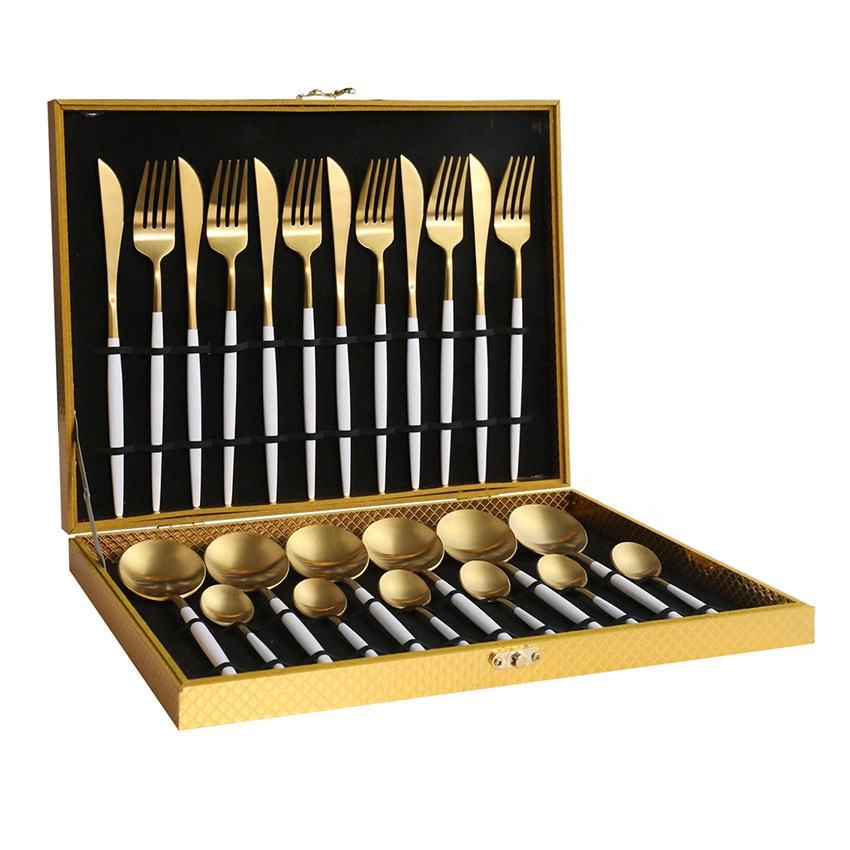 Wholesale 24pcs Stainless Steel Cutlery Set Luxury Vintage Household Flatware Set Wooden Box Package Matte Brushed Gold Cutlery