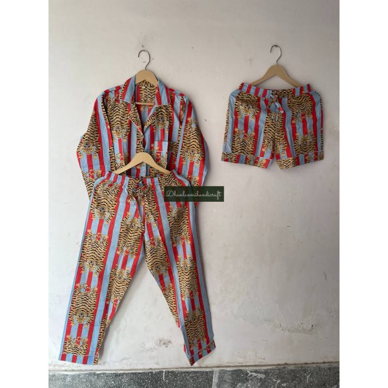 Wholesale 3-Piece Trouser Shorts Tiger Stripe Summer Cotton Pyjama Set Sleepwear Women's Breathable Knitted Unisex Shirt