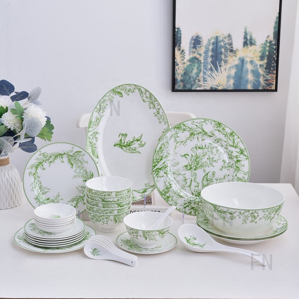 Wholesale 32pcs Nordic Minimalist Lily of the Valley Pattern High Grade Luxury Bone China Dinnerware Cup Kit Set Customized Logo