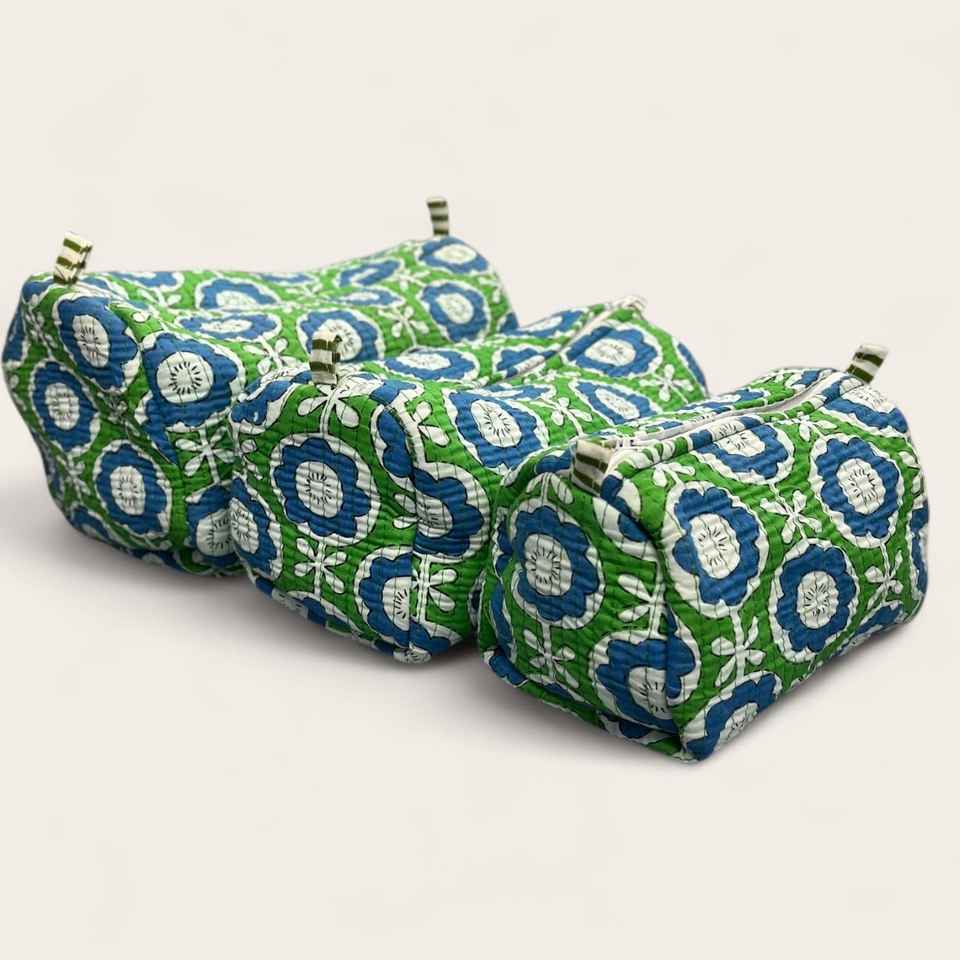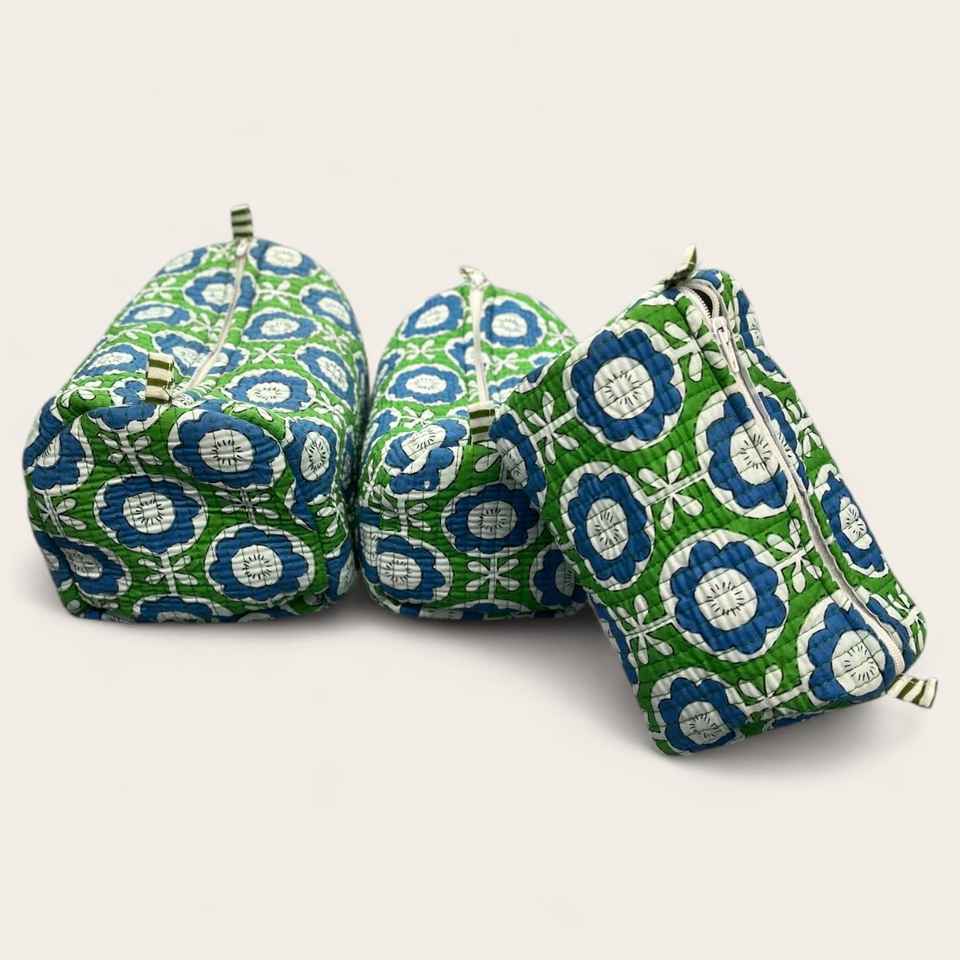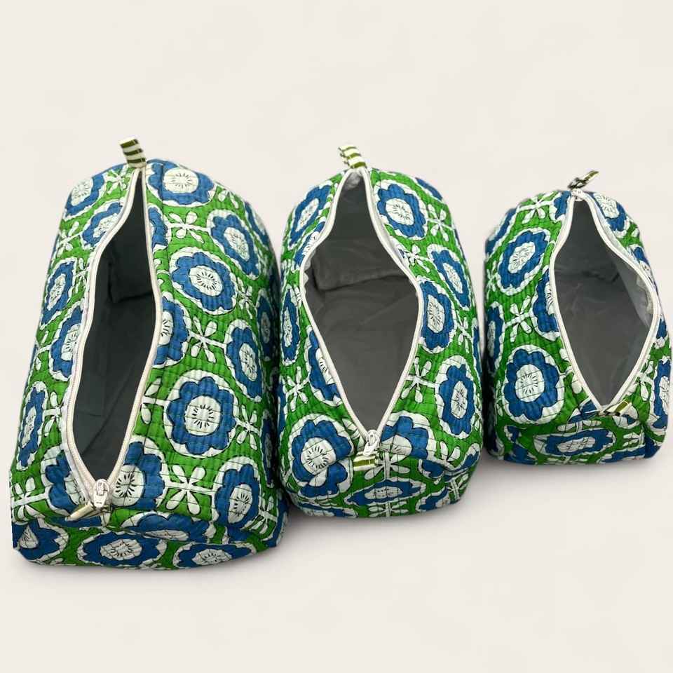 Wholesale 3pc Floral Quilted Cotton Makeup Bag Set Waterproof Hand Block Print Cosmetic Pouch