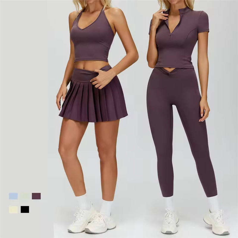 Wholesale 4 Pieces Gym Wear Women Fitness Clothes Flexible Matching Pilates Workout Skirts Leggings Zip Shirts Soft Suits