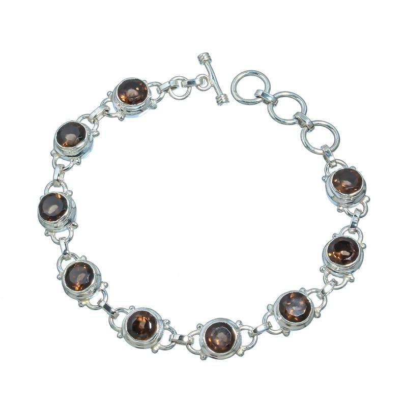Wholesale 7-8\" Handmade 925 Solid Sterling Silver Cuff Bracelet with Natural Smoky Quartz Gemstone Faceted Round Beads Gift