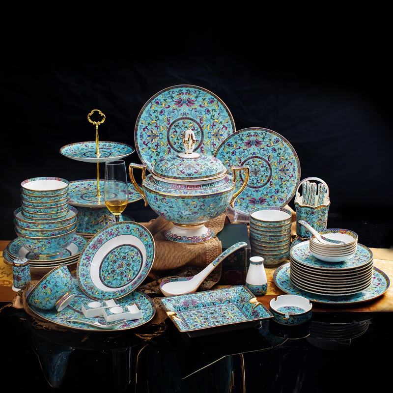 Wholesale 86pcs Chinese Classical Royal Enamel Art Home Decor Dining Room Sets Porcelain Dinnerware Sets