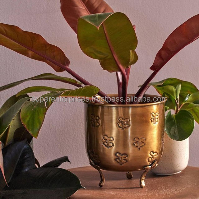 Wholesale Antique Metal Pot Planter Tall Floor Tree Planter Handmade Mid Century Brass Gold Large Planters With Free Standing