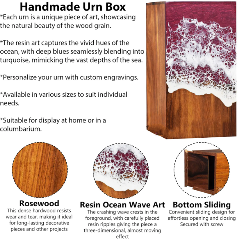 Wholesale Artistic Burgundy Ocean Wave Resin Wood Cremation Urn Handmade Custom Ashes Urn Unique Memorial Keepsake Box by AYAANS