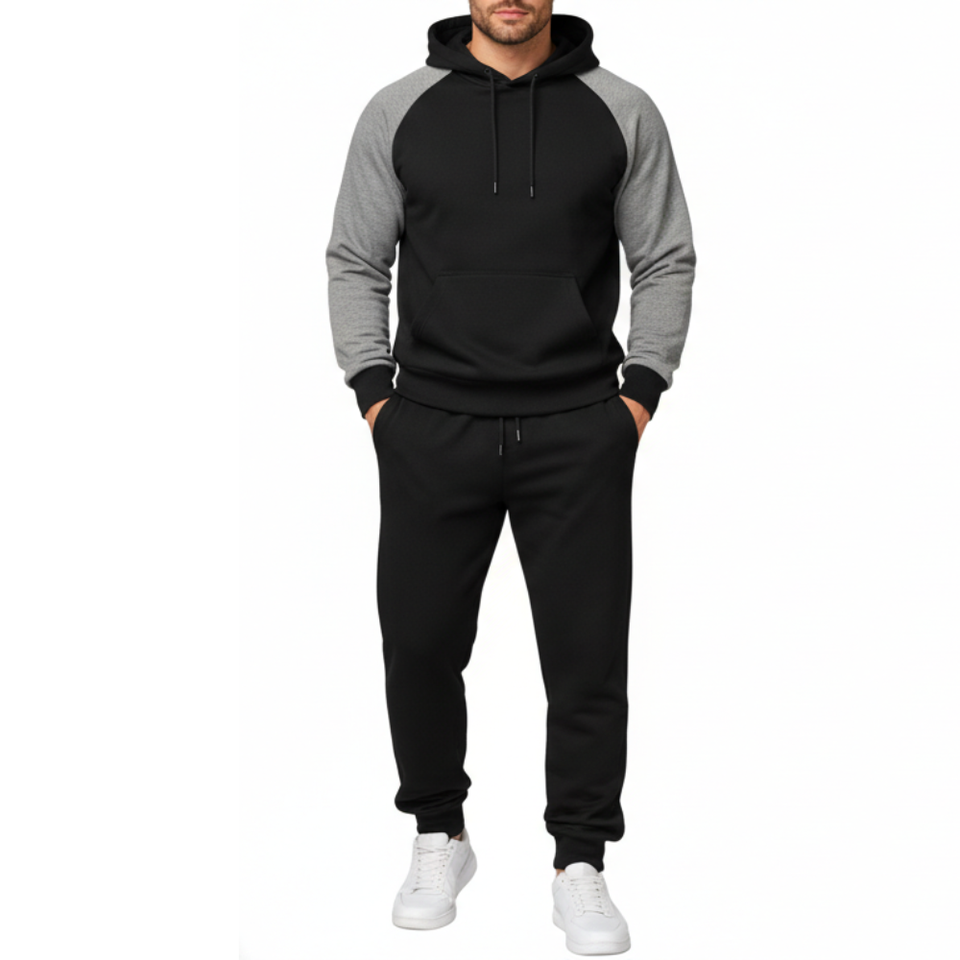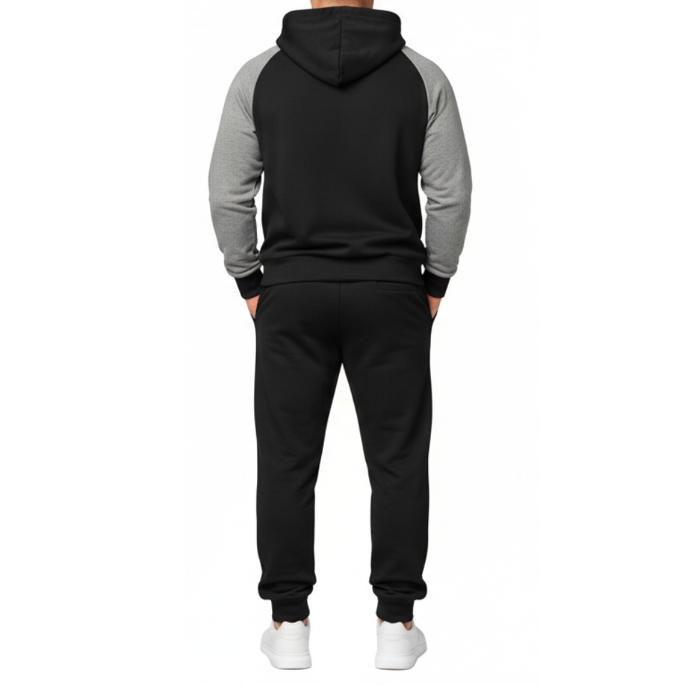 Wholesale Athletic Men's Two Tone Raglan Sleeve Tracksuit | Jogging Suit | Black and Grey Color Hoodie and trouser Set