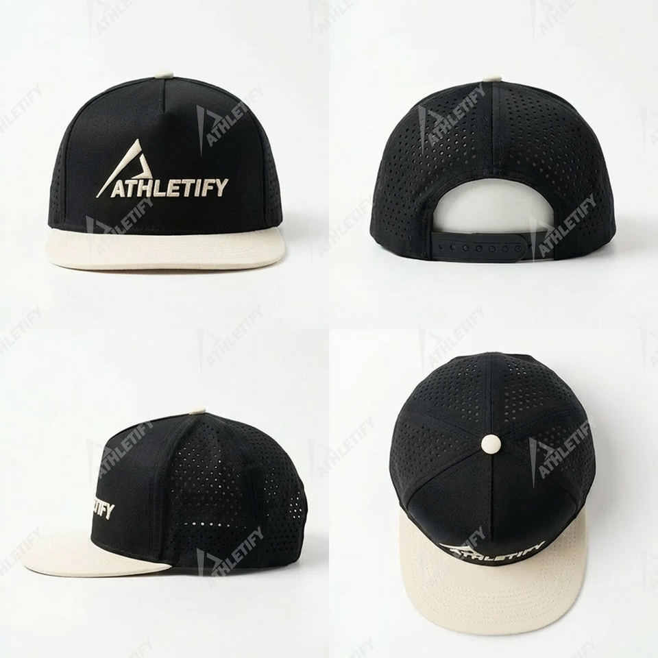 Wholesale Athletify OEM Adjustable Soft Shell Baseball Cap Laser Cut Breathable Sports Snapback Hat Performance Unisex 5-Panel
